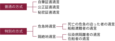 民法は、「遺言は、自筆証書、公正証書又は秘密証書によってしなければならない。ただし、特別の方式によることを許す場合は、この限りでない」と定めており(967条)、あくまで遺言の基本方式は、自筆証書、公正証書又は秘密証書による遺言です。特別の事情のもとで普通の方式に従った遺言をなしえない場合に関する特別の方式による遺言はあくまで例外的な方式ですので、ここでは、普通の方式による遺言について、説明します。
